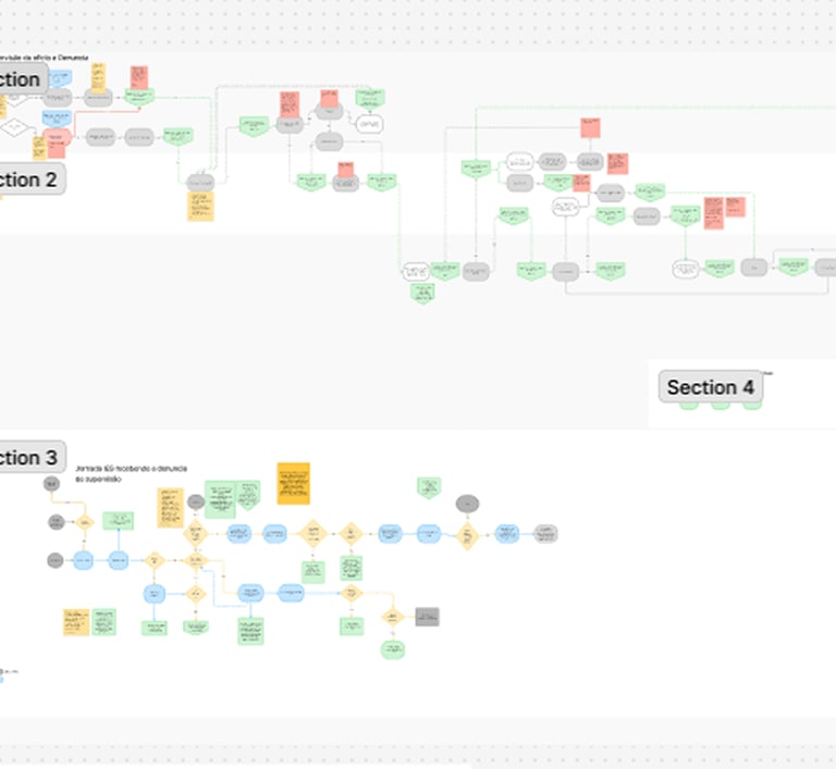 O discovery, conduzido em um mês, combinou imersão com o cliente, entrevistas, desk research e prototipação contínua. No Miro, mapeamos funcionalidades e definimos o MVP. As entrevistas geraram insights-chave que guiaram o design em um contexto complexo.